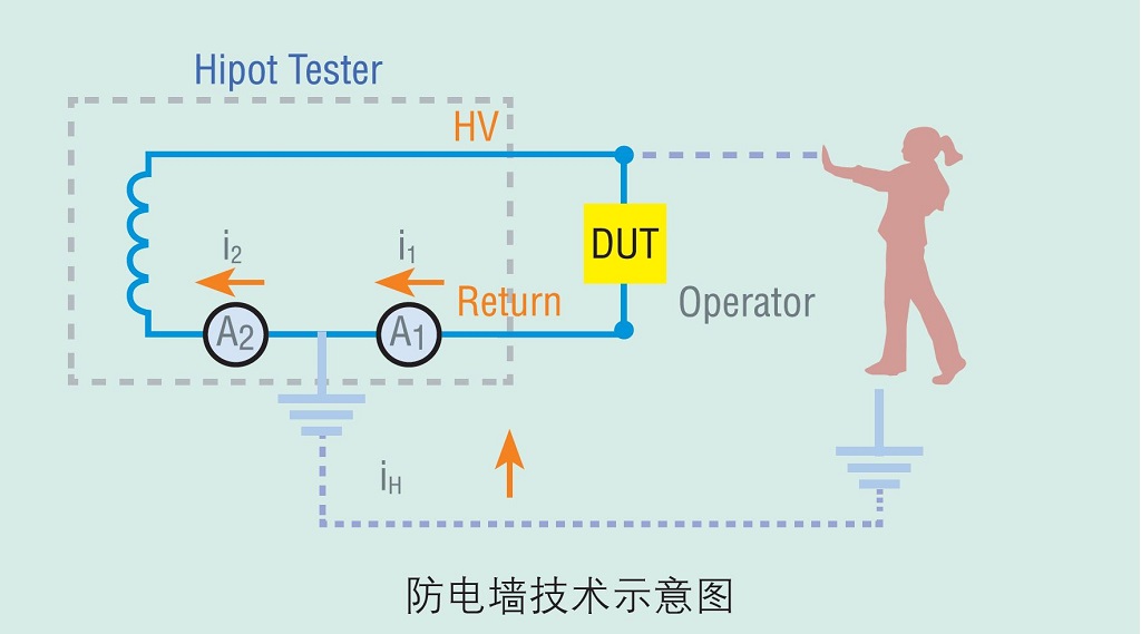 常州致新ZX9501系列耐壓機(jī)具有GFI防電墻功能來保護(hù)測(cè)試人員(原理如圖所示)。在突發(fā)人體感電的情形下,GFI能立即切斷儀器的電壓輸出,保護(hù)操作員不受電氣傷害。GFI功能偵測(cè)從地端(Earth GND)流回的電流iH與低端電流iL,比較后若大于0.5mA,則會(huì)立即切斷高壓輸出。